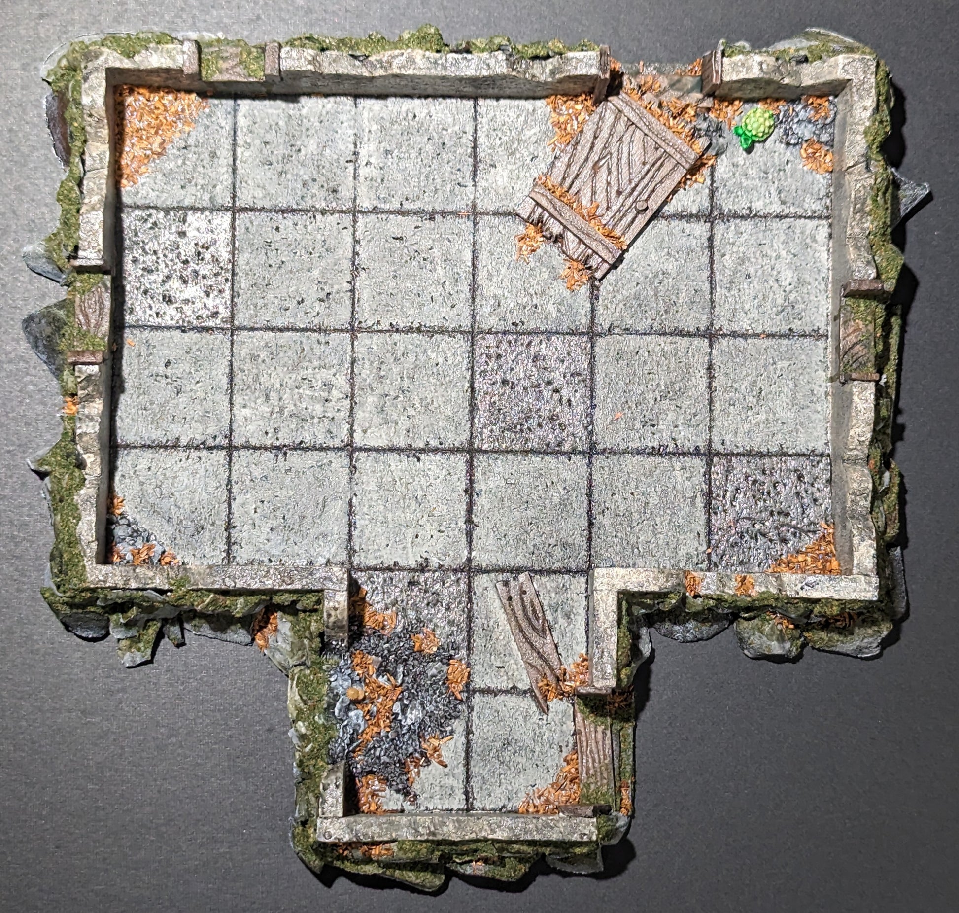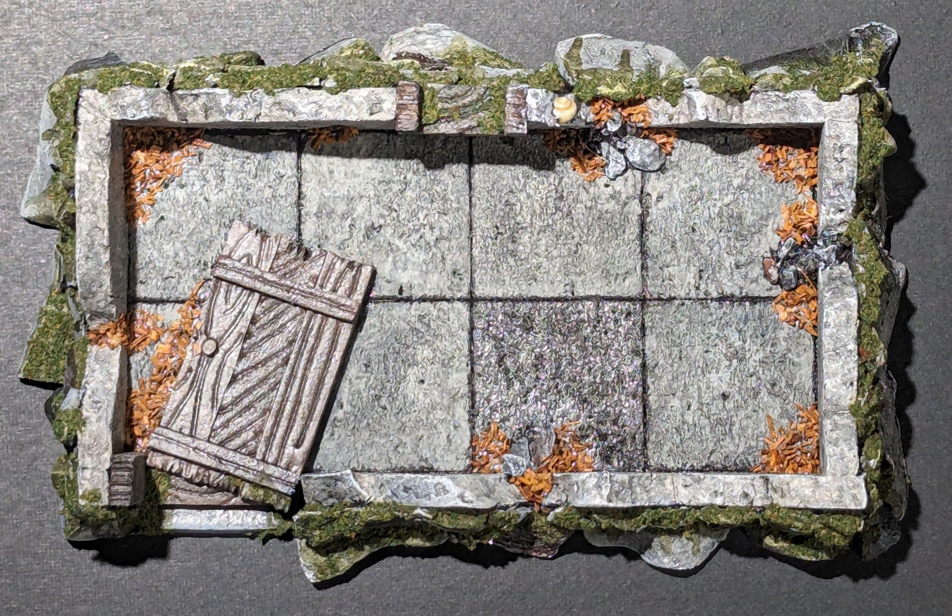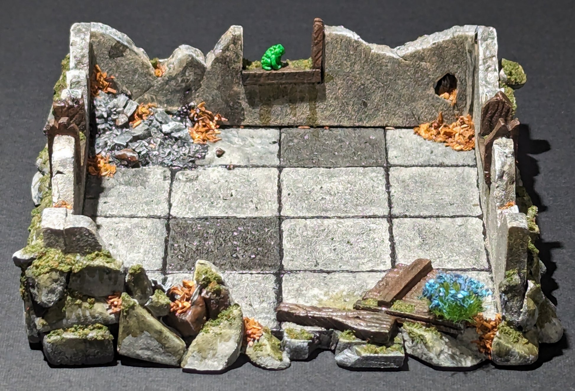 As the village comes into view you see that time has started to have its way with the abandoned buildings. Roofs have fallen in. Walls are tumbled and bearded with mosses and lichens. Mushrooms grow on collapsed doors and rotting windowsills, offering shade to frogs, snails and other small creatures. There may even be a stone tower among the trees reclaiming the town.