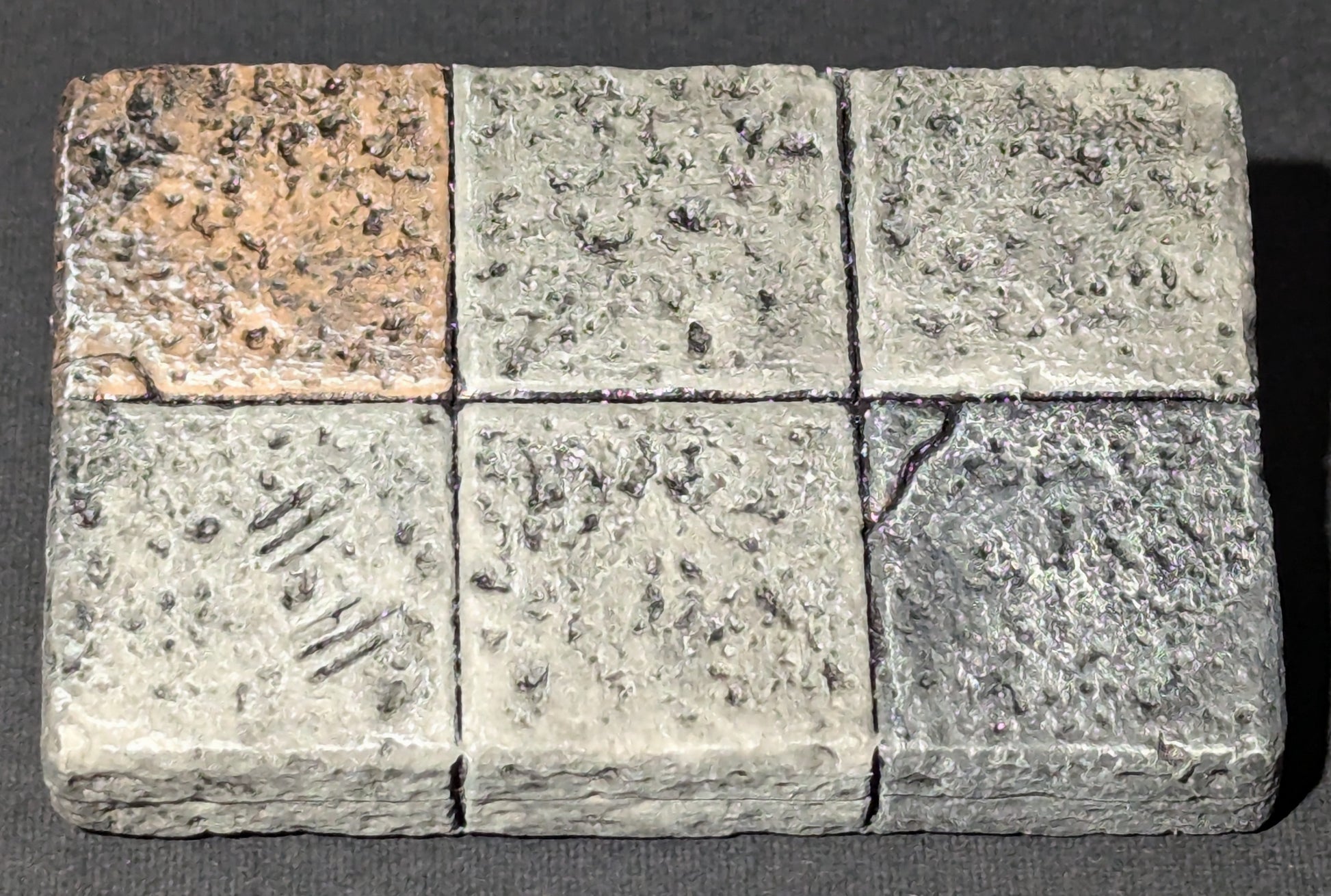 Shattered dual-sided tile, plain on the other side. Random textures, cracks, and colours.