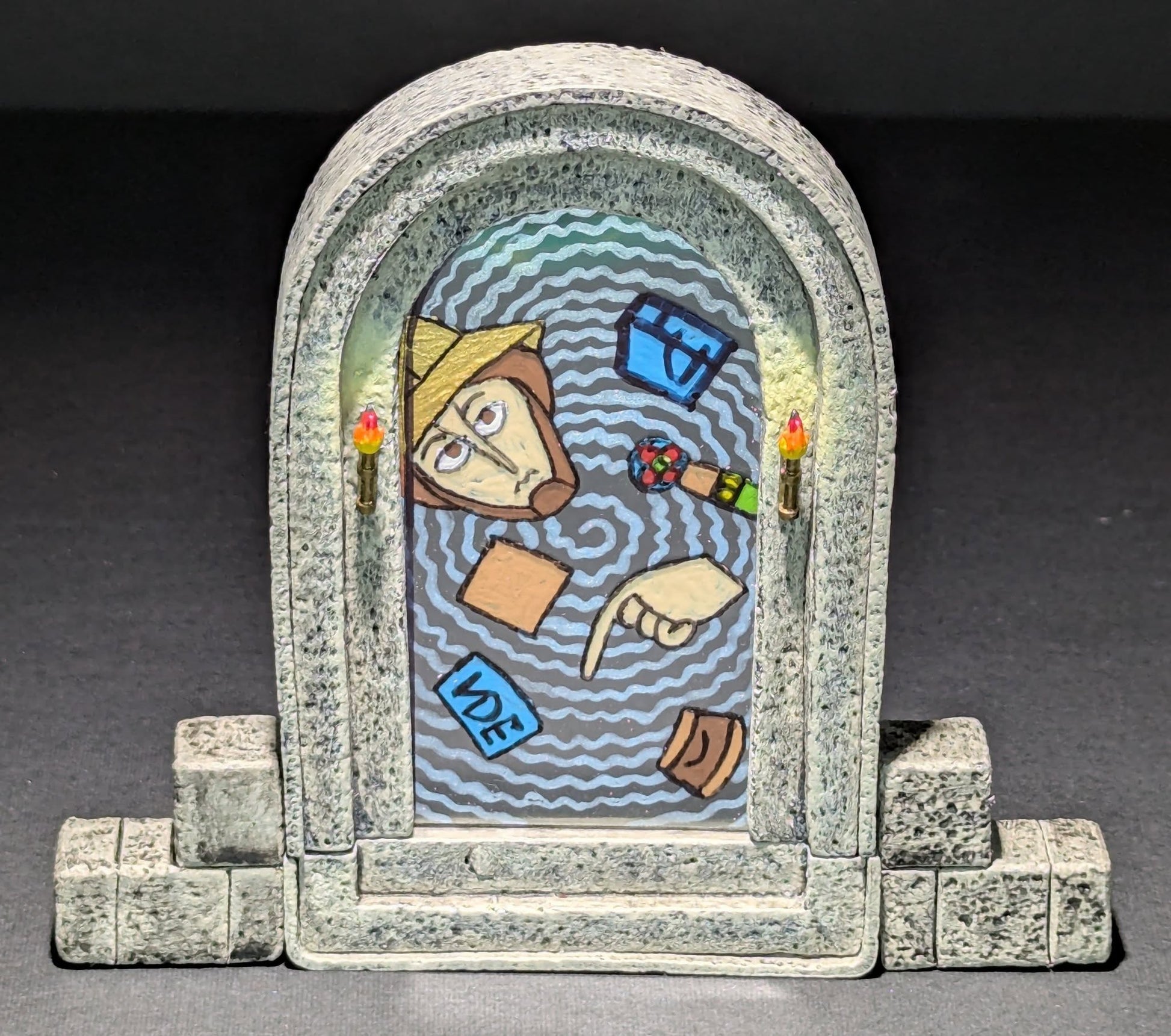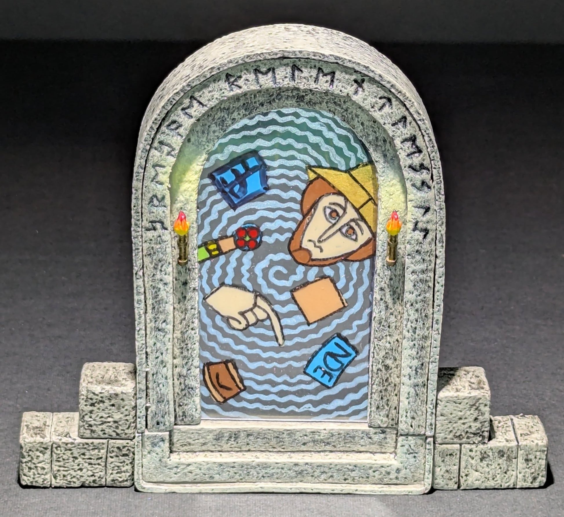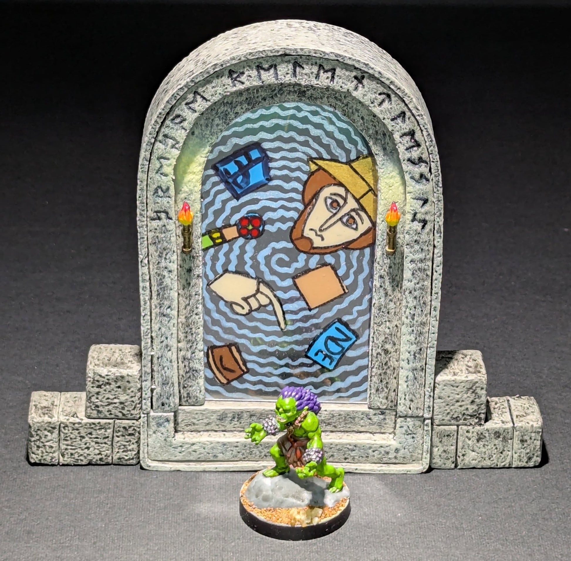 The conjuror reads from the crackling Scroll of Transit. The words vanishing in puffs of granular smoke as they are spoken aloud. The air shimmers before her, and as she finishes the last word, and the scroll crumbles to ash in her hands, the shimmering resolves itself into a large stone-framed stainglass window, with the colourful glass drifting randomly in separate pieces across the glowing tunnel beyond.