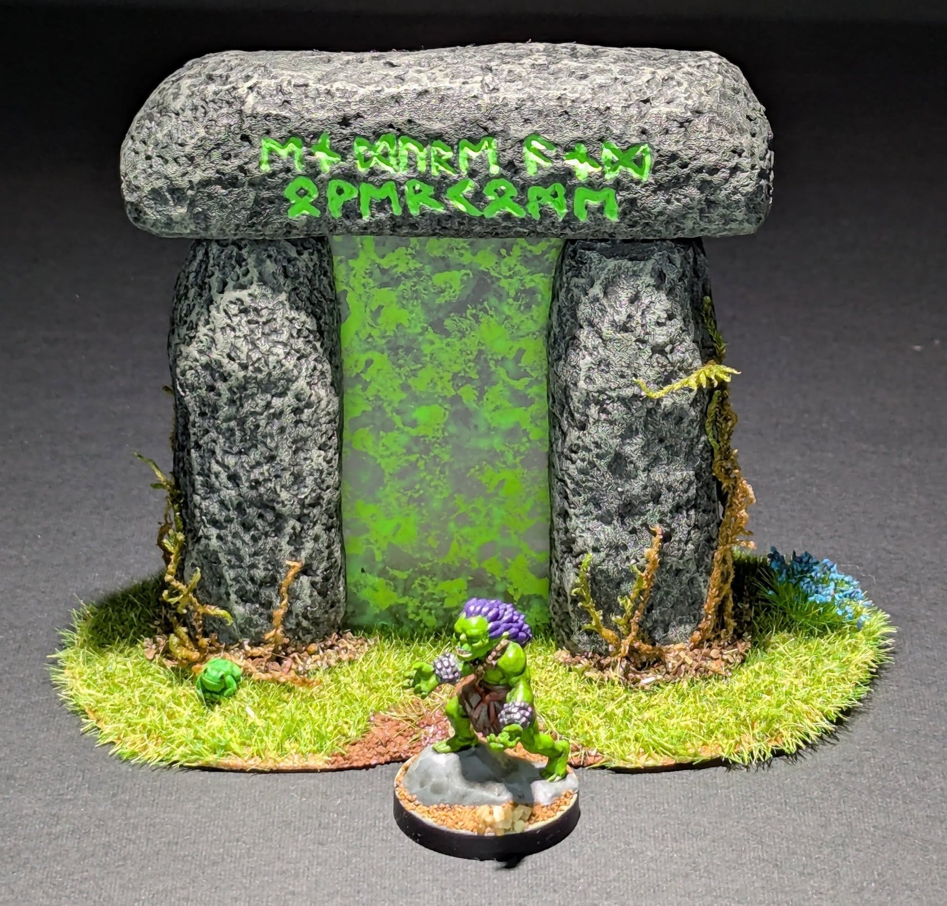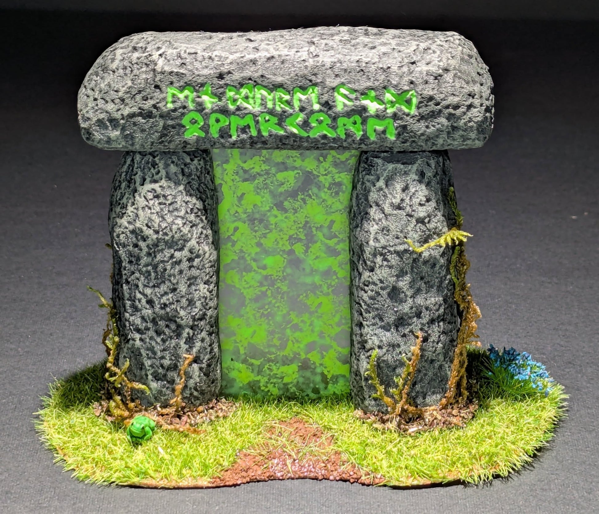 Atop the rocky outcropping stands a trilithon, weathered and mossy. Deep carved runes adorn the lintel, though they are hard to read in the gloaming light. Until they start to glow from within, growing brighter the closer you approach. Just as you think you can start to make them out, your eyes are drawn to the shimmering curtain of dappling green between the stone posts. A waving promise of spring leaves and fresh grass. You can almost smell the inviting air beyond.