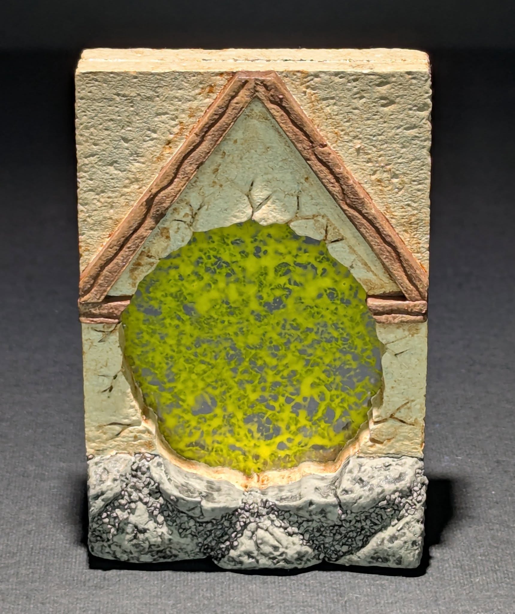High up on the wall, some vandal has carved brutal and rushed runes into the plaster and daub of the inn's back room. The cleric, always one to show off their knowledge of languages, reads the words aloud to the party. Once spoken, the sound of creaking, crumbling, and snapping starts to come from the wall. The plaster grinds off, the mud-and-muck daubing crumbles onto the hardwood, and the lithe mesh of wattle snap and fall... into... the swirling yellow fog that fills the newly formed hole in the middle of the wall. This fog tugs at you, too.