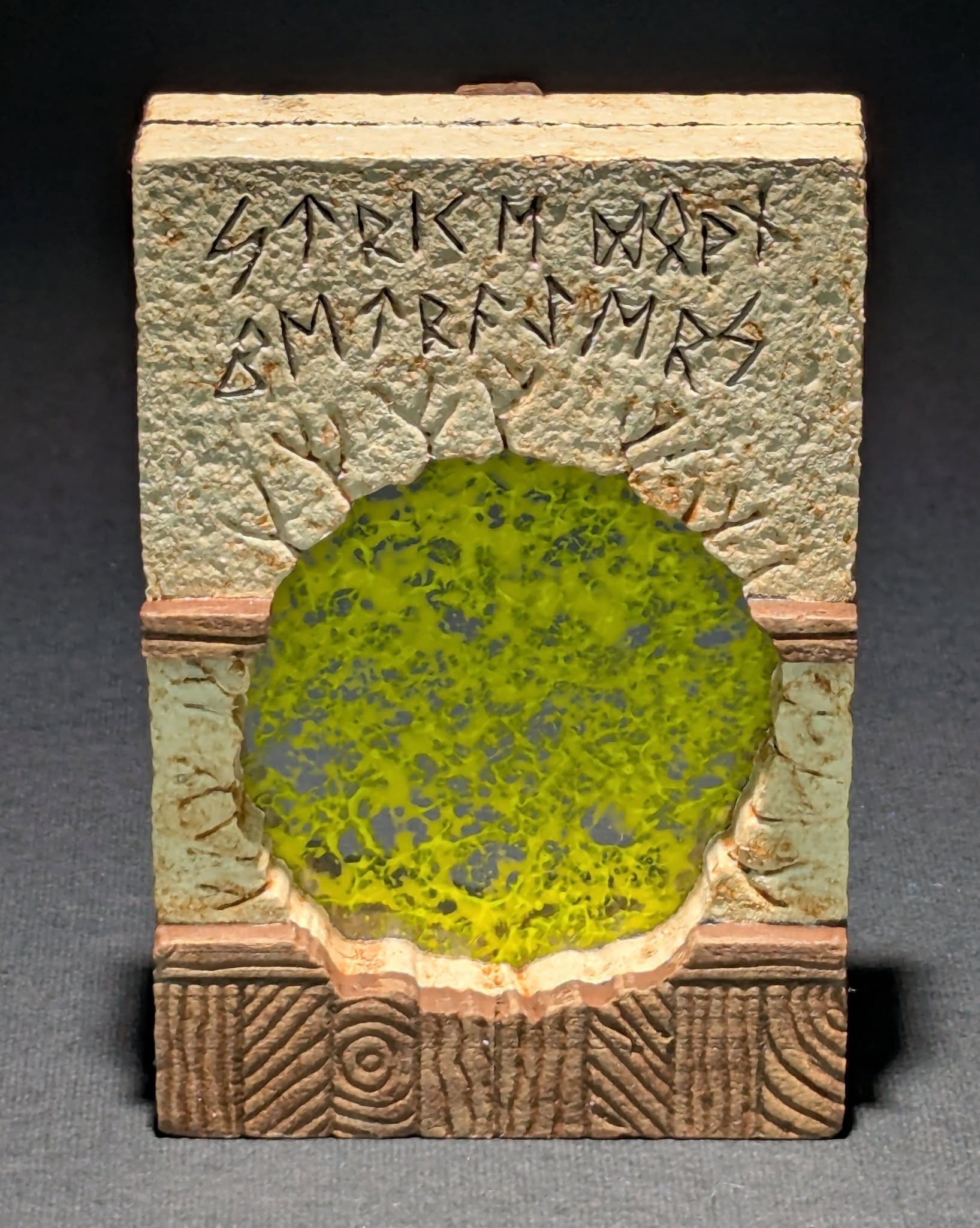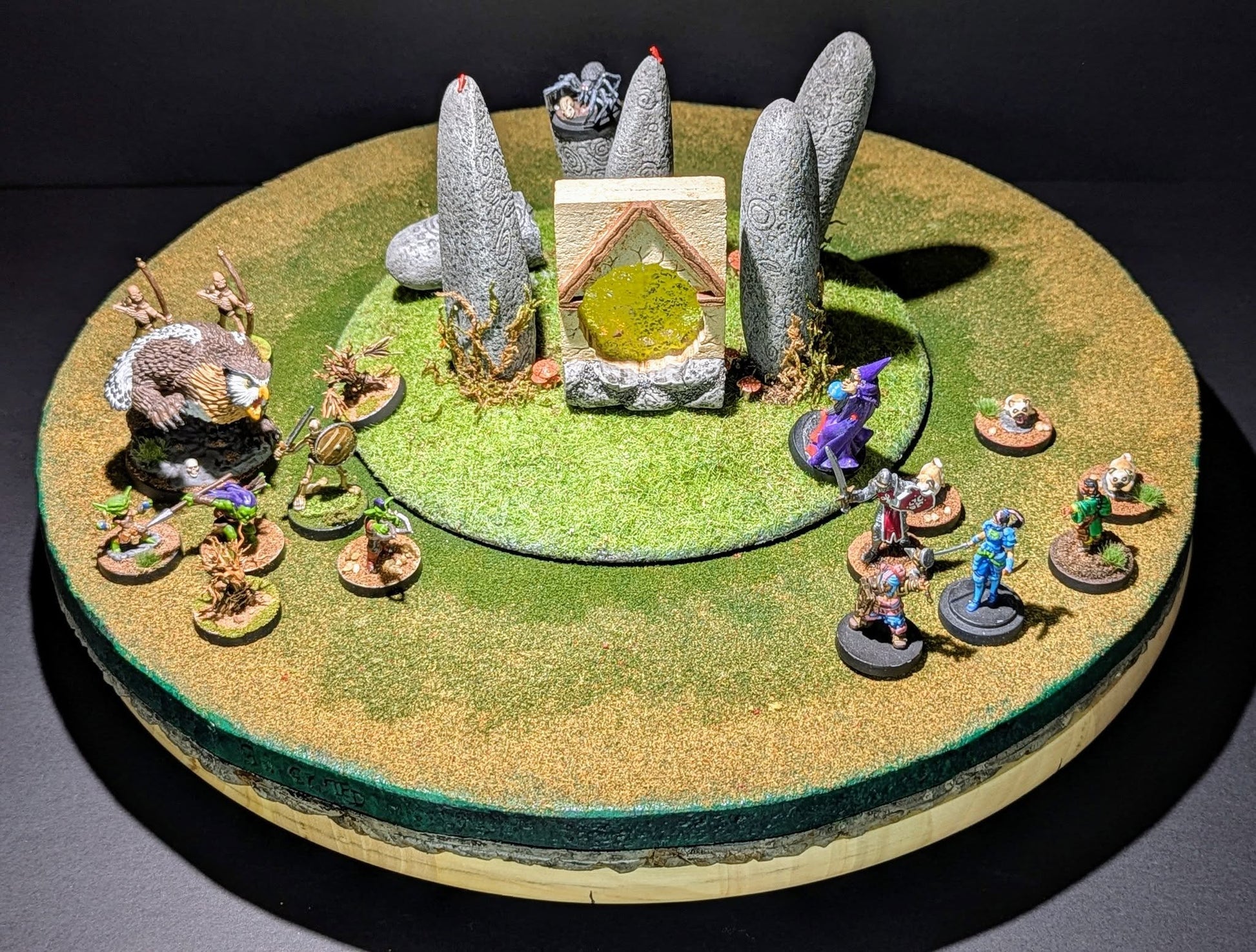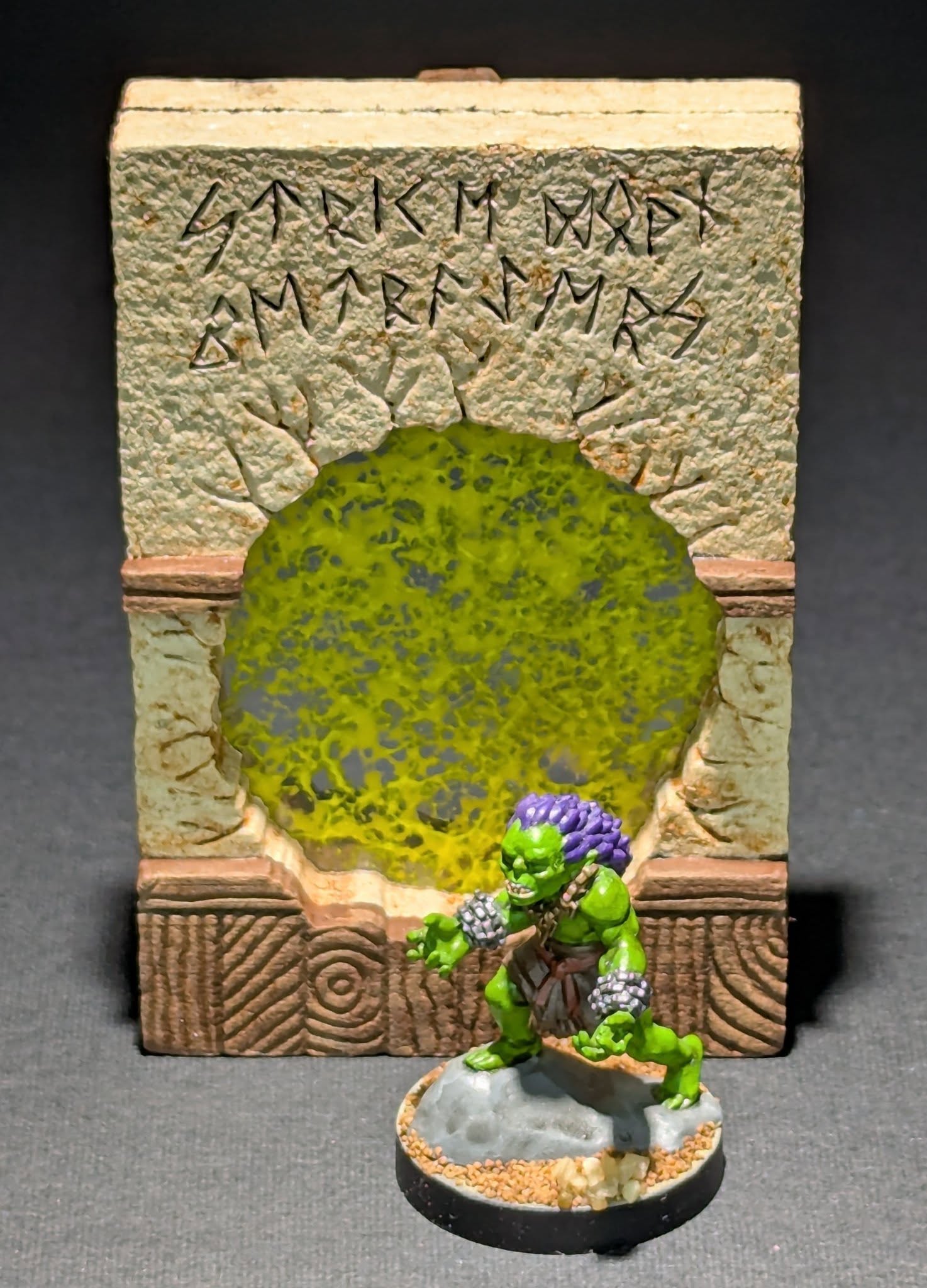 As you are chased towards the ancient stone circle by countless goblins - too many to make a stand against - the monk chants a spell under his breath. Flinging his arms out towards the stones, from the ground rises a small section of what can only be the wall of a building - plaster, proud wooden beams, stone foundation, and all. Centered on the wall is a hole with an obvious magic gateway within. You each leap onto the stones and hurl yourselves through the portal as the goblins' spears start to land around you.